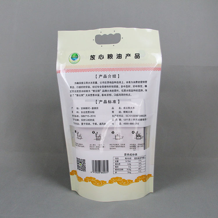 大米小米包裝袋有時候作為直接包裝,因此需要做成真空袋,又稱貼身防潮袋、鋁箔袋、鋁塑復合袋,其材質一般為PET/AL/CPE或PET/NY/AL/CPE.其中PET——印刷效果好,NY——透氧性低,AL——阻隔性強、不透光,CPE——包裝內層。膠水:水溶性膠水(更加衛生、環保、無溶劑殘留量)此產品具有良好的防靜電、隔氧、屏蔽、防潮、遮光功能及優良的熱封性。